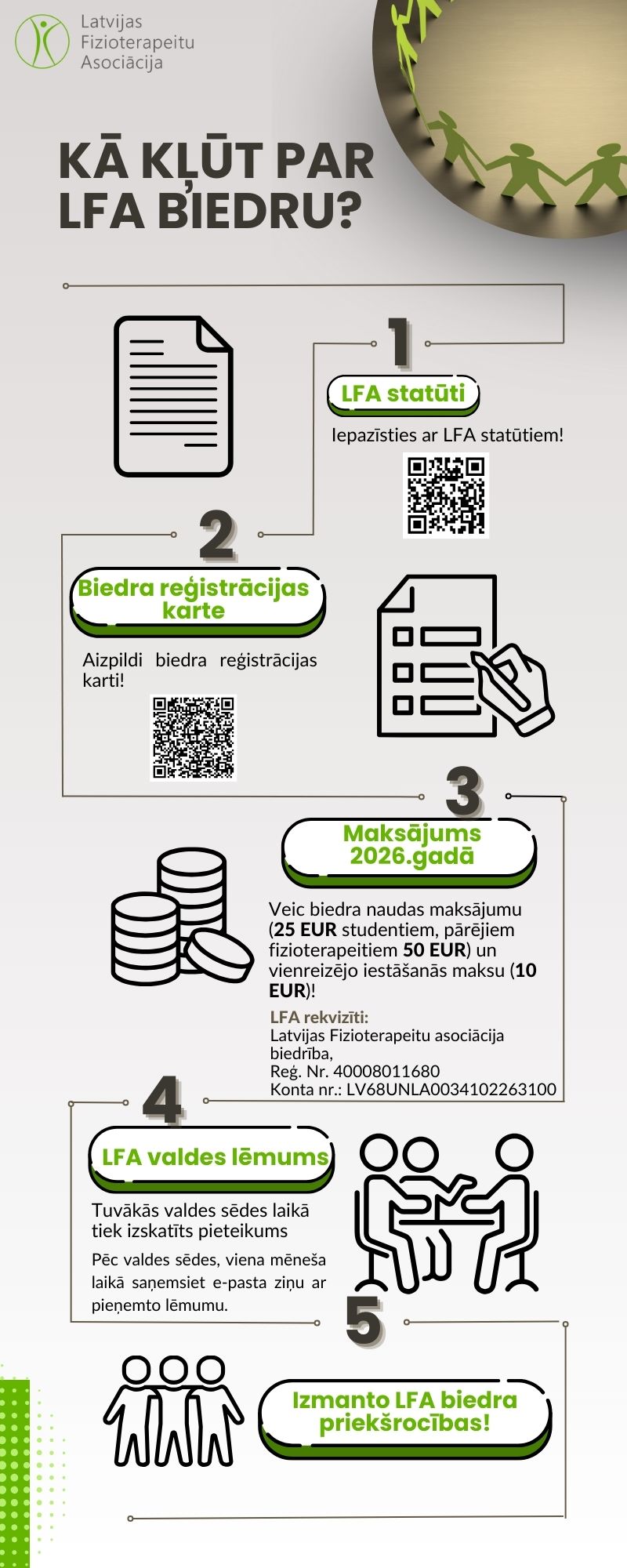 1. Lai kļūtu par Latvijas Fizioterapeitu asociācijas biedru, jāiepazīstas ar LFA statūtiem, LFA Privātuma politiku un jāaizpilda biedra reģistrācijas karte.